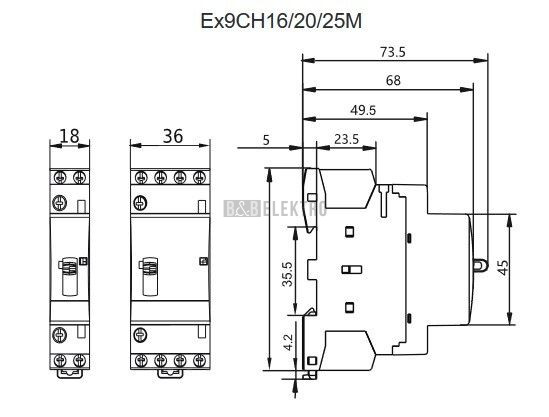 Zařízení má jmenovitý proud 20 A a ovládací napětí cívky 230 V AC. Montáž je možná na DIN lištu s šířkou 1 modul. Optický indikátor na přední straně signalizuje stav kontaktů.