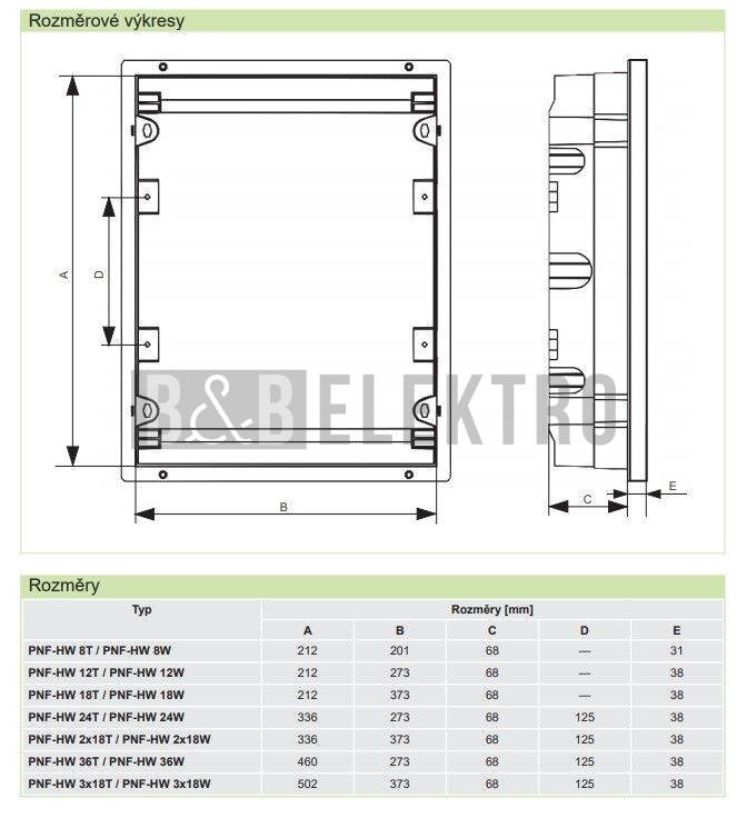 Rozvodnice PNF-HW jsou určeny zejména pro domovní aplikace. Jejich design je přizpůsoben montáži pod omítku. Dvojitý systém uchycení umožňuje použití i do dutých stěn (testováno zkouškou žhavou smyčkou při 850°C). Balení obsahuje vlastní rozvodnici, dveře, přístrojové DIN lišty, N + PE svorkovnice, čelní kryt s výřezem pro přístroje, záslepku neobsazených pozic a upevňovací materiál.
