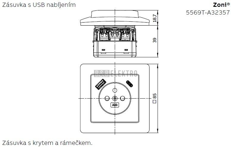 Zásuvka jednonásobná s 1xUSB-A, 1xUSB-C a ochranným kolíkem Zoni® v barvě bílá (lesklá) od českého výrobce ABB