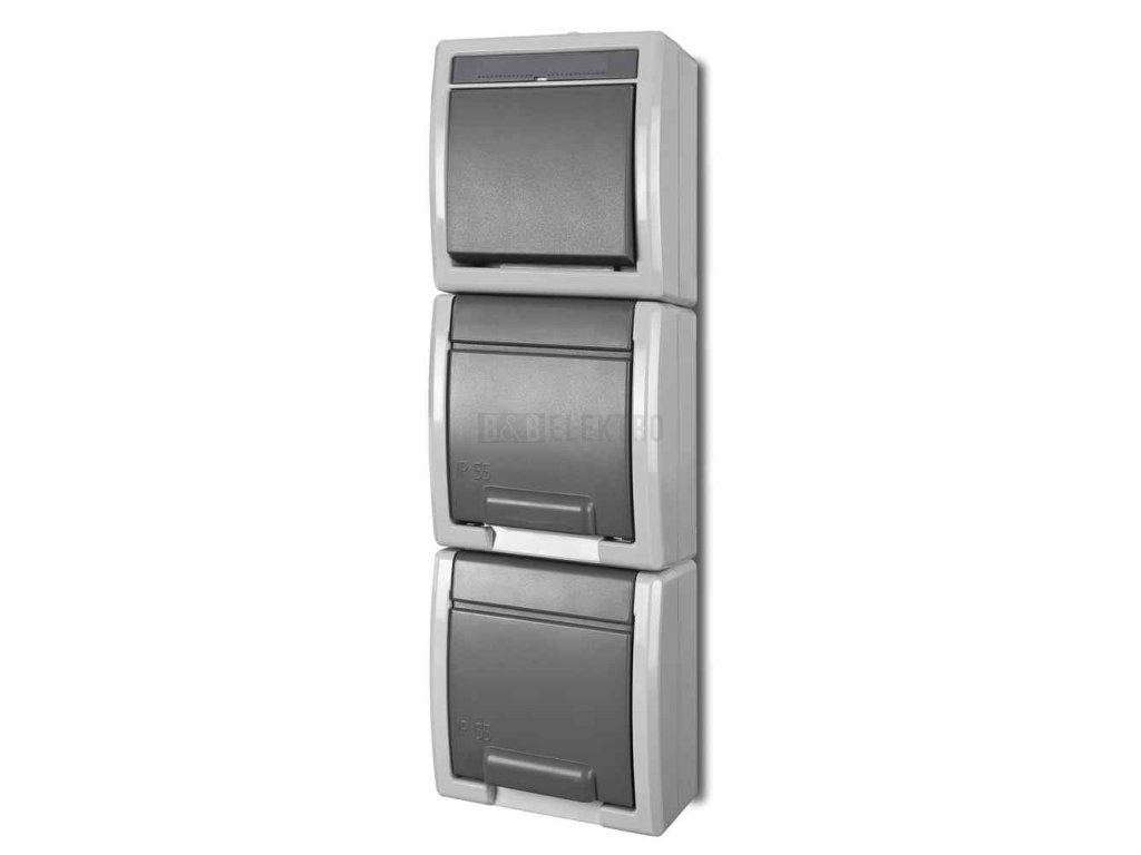 ATLAS 19096 IP55 Přepínač č.6 + zásuvka 2x 2P+PE, 2-násobná svisle s ochr. kolíkem, na povrch, šedý.