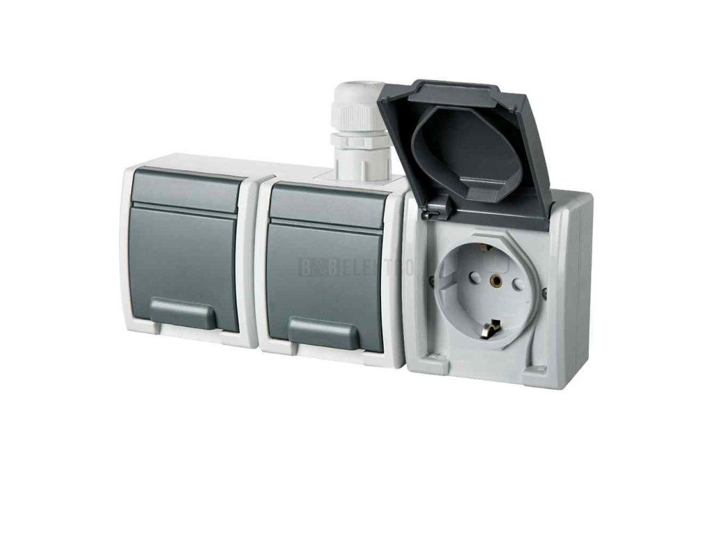 ATLAS 19189 IP65 Zásuvka 3x 2P+PE SCHUKO, 3-násobná vodorovná s vývodkou M20, na povrch, šedá.