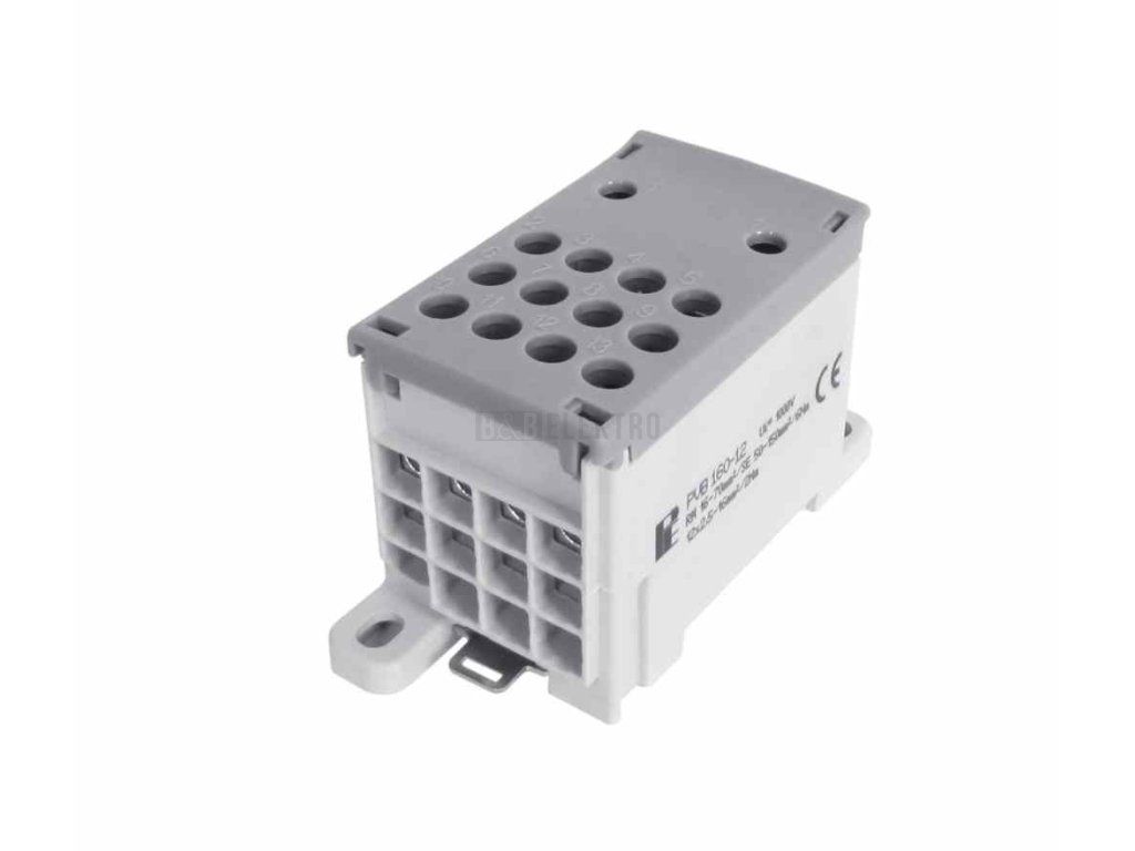 Blok pro rozdělení fází PVB 160-12, 1pólový, pro AL/CU vodiče, jmenovitý proud 160A, jmenovité napětí 1000V, barva šedá, montáž na DIN lištu / PANEL, krytí IP20, vstup 1x95mm2, výstup 12x16mm2. Rozměry ŠxVxH: 40x48x85 mm.