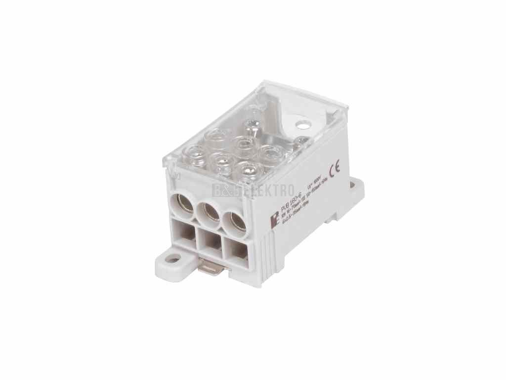 Blok pro rozdělení fází PVB 160-6, 1pólový, pro AL/CU vodiče, jmenovitý proud 160A, jmenovité napětí 690V, barva šedá, montáž na DIN lištu / PANEL, krytí IP20, vstup 1x95mm2, výstup 6x35mm2.