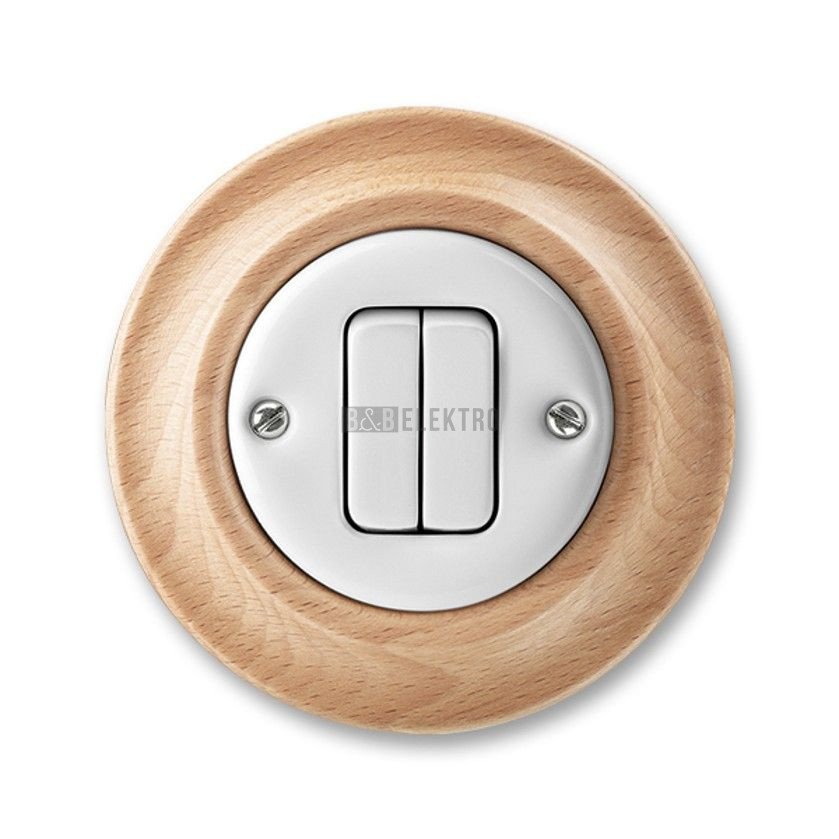 Porcelánový vypínač č.6+6 dvojitý schodišťový ABB Decento v retro stylu, bílá barva / přírodní dřevo buk