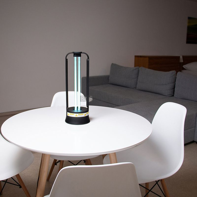 - lampa má moderní design v černé barvě, kompaktní velikost, jednoduché ovládání a je nenáročná na údržbu. Šňůrový přívod o délce 1,5 metru je zakončen vidlicí pro připojení do běžné zásuvky. Součástí balení je výstražná visačka a dálkové ovládání. Bezpečný provoz lampy zajišťuje funkce opožděného startu, která odloží aktivaci časovače o 10 vteřin, a integrovaný senzor pohybu osob nebo domácích zvířat, který v případě potřeby proces dezinfekce přeruší. Jakékoliv znečištění povrchu trubice snižuje účinnost dezinfekce, proto trubici udržujte čistou a dle potřeby ji otřete měkkým hadříkem bez použití organických rozpouštědel.