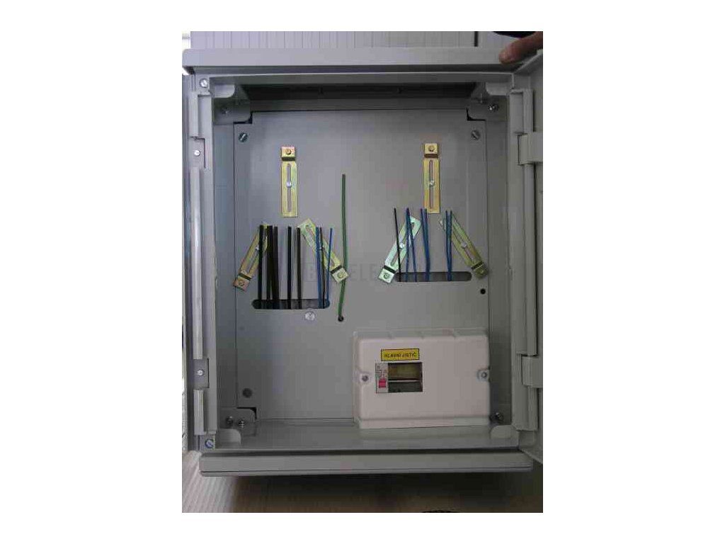 Elektroměrový rozvaděč v provedení z Termoplastu pro jeden dvoutarifní třífázový elektroměr pro měření do 40A (popř.50-100 A - musí být uvedeno v objednávce - použití větších průřezů při drátování). Je určen pro zabudování do výklenku ve zdi. Je určen pro zabudování do výklenku ve zdi. Osazení 1xmůstek PEN, 1xjistič 2A char.B pro HDO,řadové svorky. Hlavní jistič není součástí rozvaděče.Přístroje na elektroměrové desce s plombovacím krytem jističů.