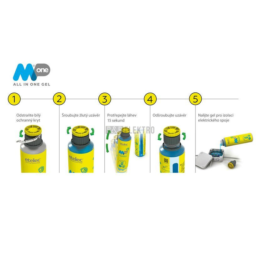 Dvousložkový zalévací gel - ETELEC MPone. Pro výplň a izolaci elektrických spojů. Rychle a jednoduše chrání spoj před nepříznivými přírodními vlivy jako je vlhkost, prach a další nečistoty. Složky gelu "A" i složka gelu "B" jsou obsaženy v jedné láhvy. Po smíchání obou složek gelu je výsledná hmota průhledná s nízkou viskozitou a po vytuhnutí zůstává po celou dobu životnosti spoje rosolovitá. Při samotném vylévání krabičky nebo jiného média krásně zatéká do všech zákoutí. Spoj lze po vytuhnutí jednoduše rozebrat. Gel je šetrný k životnímu prostředí. Navíc nemá žadnou expiraci - můžete jej uchovávat/skladovat mít jej k použití kdykoliv bude potřeba. Dielektrická pevnost 25,5 kV/mm.