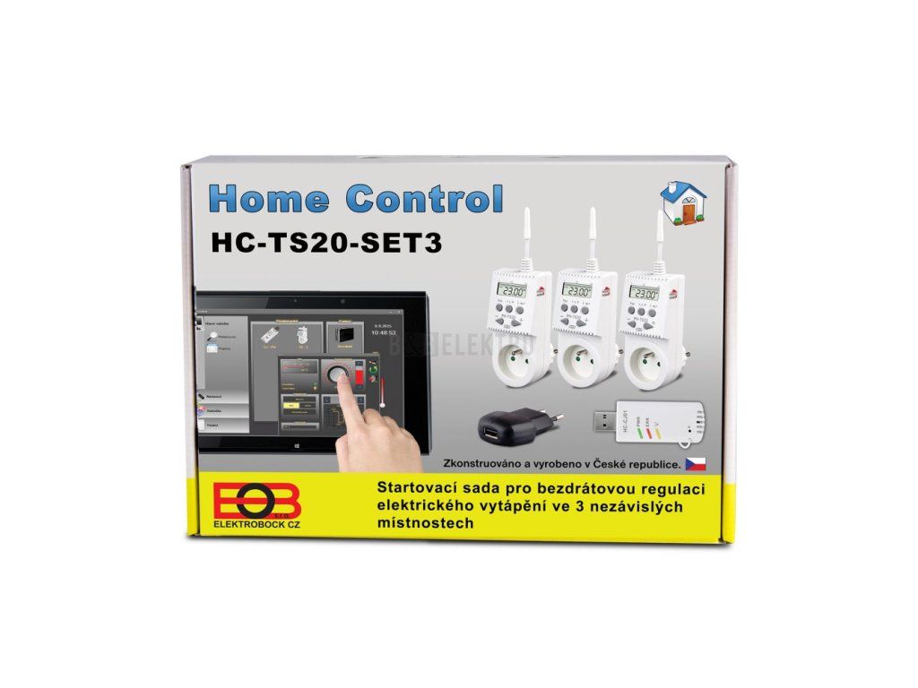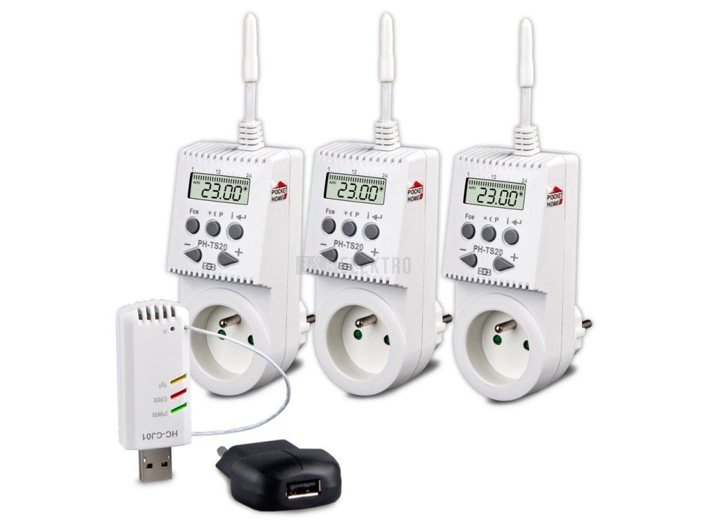 Set systému Home Control HC-PH-TS20 se třemi tepelně spínanými zásuvkami slouží pro elektrické topné soustavy. Umožňuje nastavit teplotu v celém domě nebo v jednotlivých místnostech, zjištění aktuálních teplot i automatickou regulaci podle předem nastavených programů.