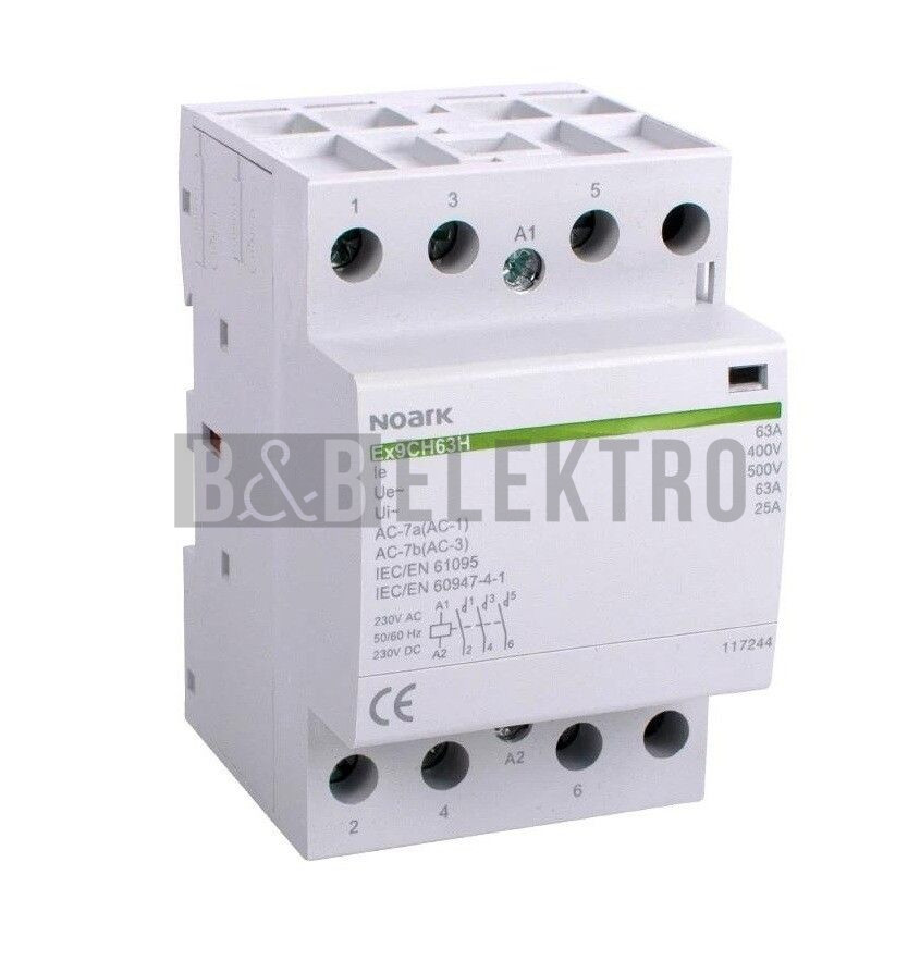 Tichý instalační stykač Noark Ex9CH40H 31 s jmenovitým proudem 40 A, ovládacím napětím 230 V AC/DC a kombinací tří spínacích (NO) a jednoho rozpínacího (NC) kontaktu. Vhodný pro spínání osvětlení, topení nebo ventilace v domovních i komerčních rozvodech, zejména tam, kde je kladen důraz na nízkou hlučnost.