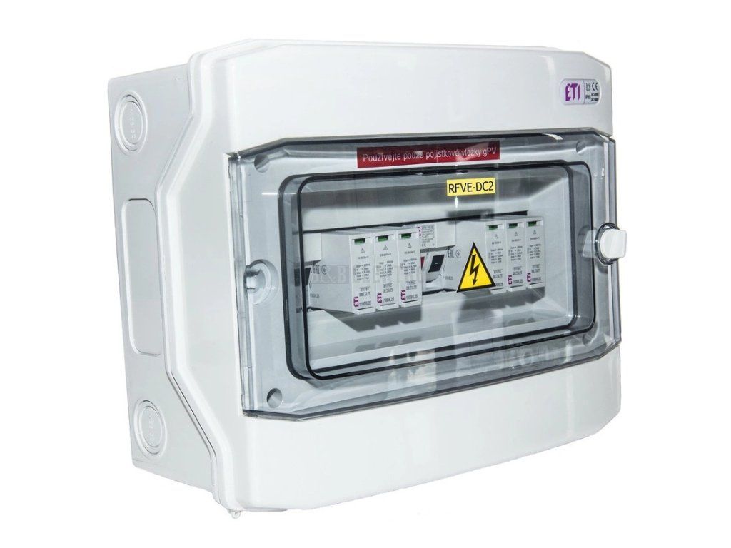 Rozvaděč ETI RFVE-DC2-2-T12S pro FVE, nástěnná, pro dva stringy, 12 modulů, krytí IP 65, výplň 2× svodič přepětí T1+T2 PV 1100/6,25 Y, 2× pojistkový odpojovač DC 2p, 4× pojistka 10×38 gPV16A/1000V