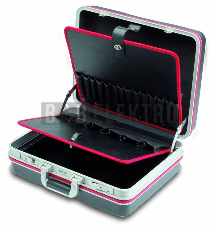 umělohmotný kufr na nářadí a příslušenství METRO v černé barvě se 2 zámky, hliníkovým rámem, 2 vnitřními stěnami s mnoha přihrádkami a prostorem pro dokumentaci