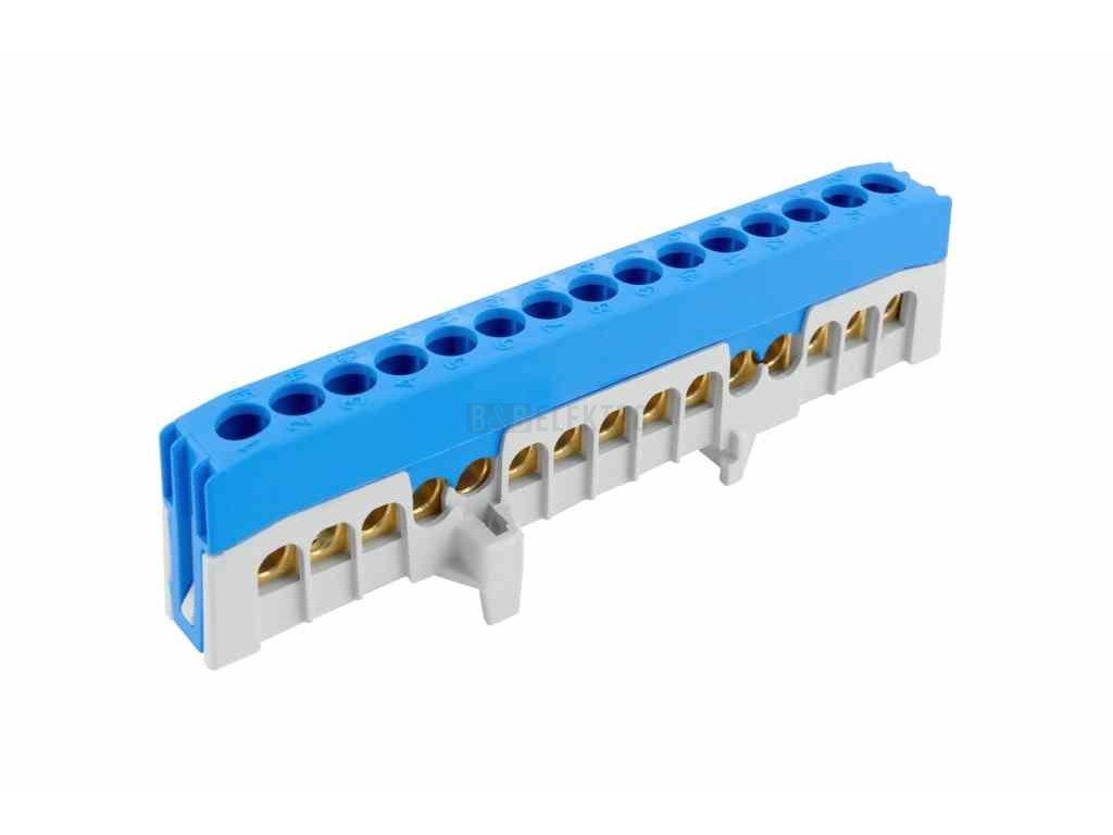 Můstek N 15-F2 (svorkovnice 15x16mm2), krytý IP20, modrý, 63A, na DIN, rozměr 110x12x27mm.
