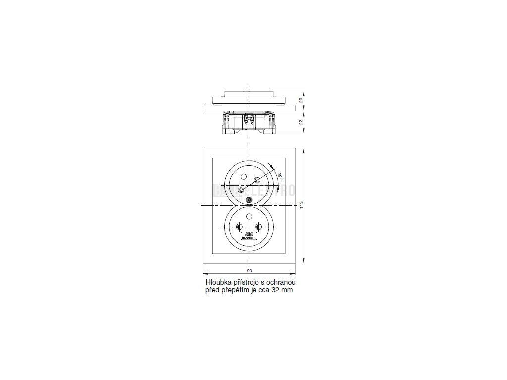 Typ: Zásuvka dvojnásobná s ochrannými kolíky, s clonkami, s natočenou dutinou, s ochranou před přepětím