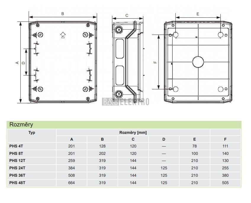 Rozvodnice PHS jsou určeny pro obecné i průmyslové aplikace, ve kterých je požadován vysoký stupeň krytí IP65. Jsou nabízeny v jedno až čtyřřadém provedení pro 4 až 48 modulů. Konstrukce je uzpůsobena k povrchové montáži. Rozvodnice jsou dodávány s průhlednými dveřmi. Balení obsahuje vlastní rozvodnici, dveře, přístrojové DIN lišty, N + PE svorkovnice, čelní kryt s výřezem pro přístroje, záslepku neobsazených pozic a upevňovací materiál.