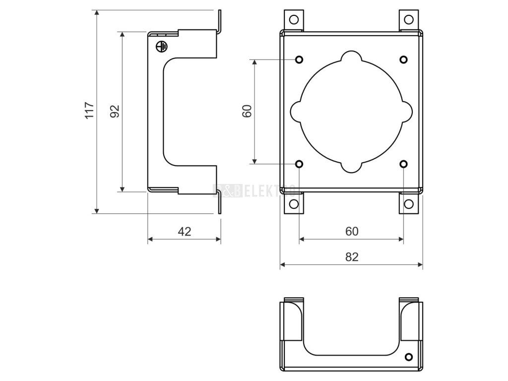 Přístrojový nosič pro montáž vestavných zásuvek 400 V (16 A). Instalace pod montážní desku, dodávanou k sestavám KUZ-VO a KUZ-VOI. Obsahuje šroubek M4X6 a vějířovou podložku pro uzemnění. Rozteč pro upevnění zásuvek je 60 mm. Vhodné přístroje: SEZ IEN 1653, SEZ IEN 1643. Při nastavené hloubce krabice KUZ min. 105 mm - MENNEKES TYP 1385, BALS TYP 132001, ABB 416RU6.