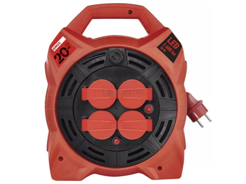 Venkovní prodlužovací kabel na bubnu 20 metrů, 4x zásuvka, guma, 230V, průměr kabelu 1,5 mm2 s LED reflektorem EMOS