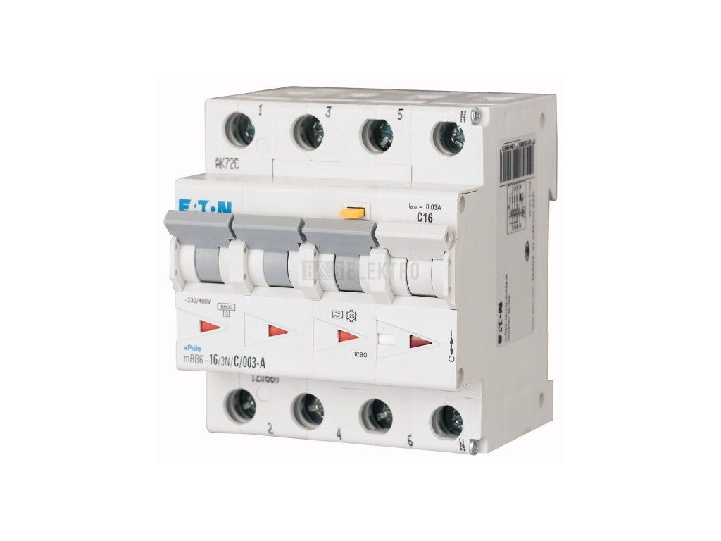 Proudový chránič s jističem 16A, mRB6-16/3N/B/003-A 30mA A čtyřpólový Eaton 120652
