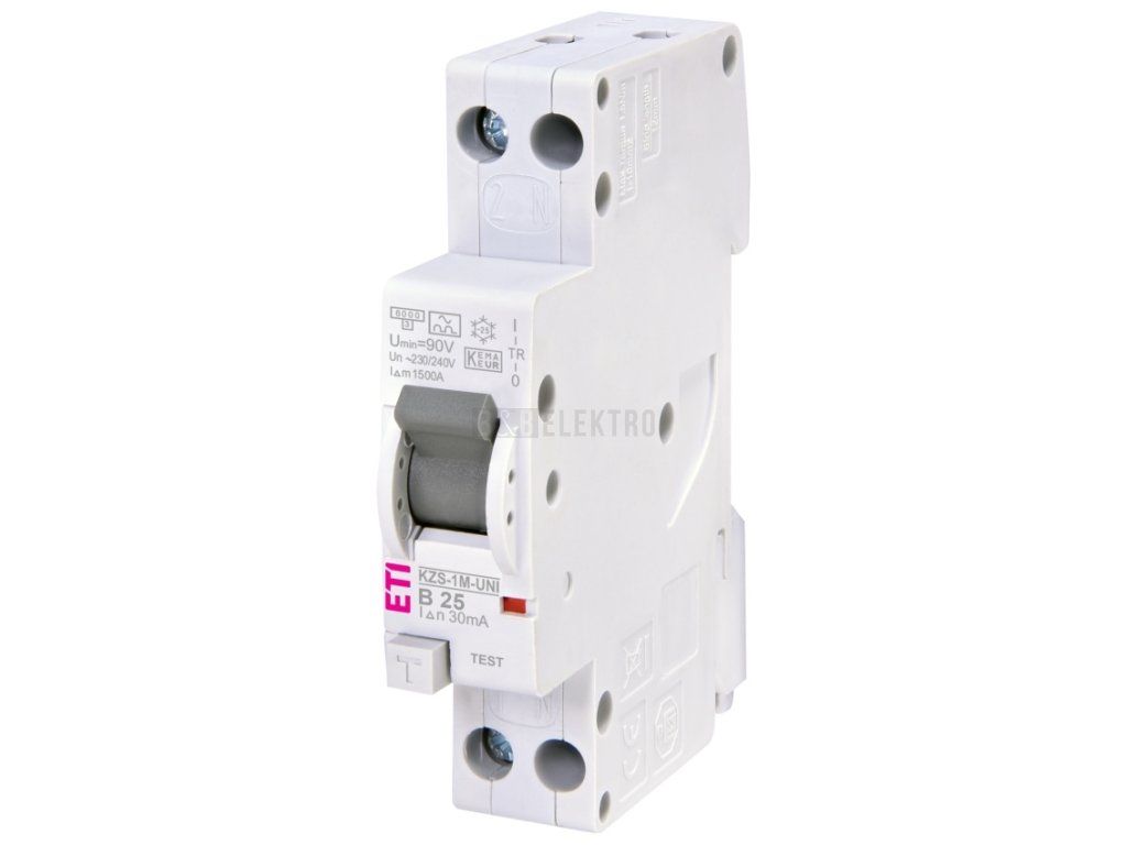 Proudový chránič s jističem 25A, KZS-1M UNI 1p+N A B25/0.03 6kA 30mA A ETI 002176026