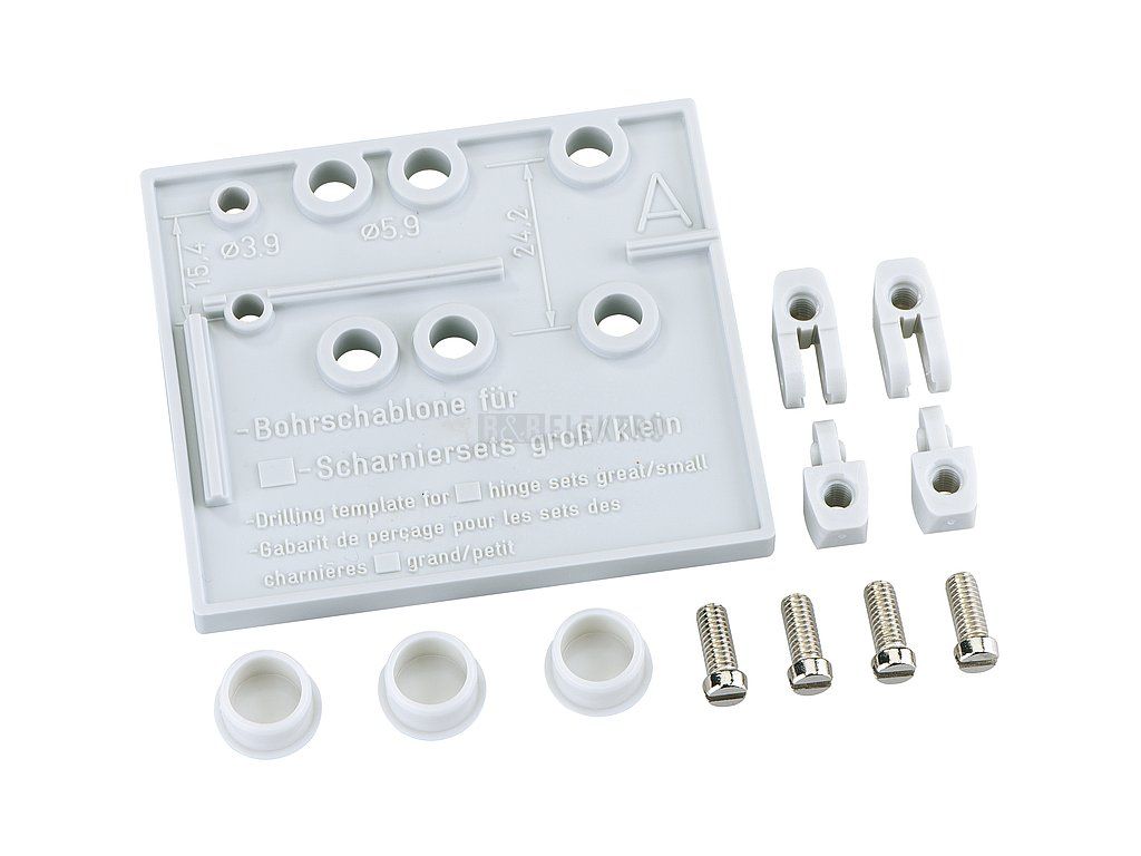 Sada vnějších závěsů pro přestavbu víka skříně na vyklápěcí dveře, včetně 2 závěsů, upevňovacích šroubů, záslepek a vrtací šablony