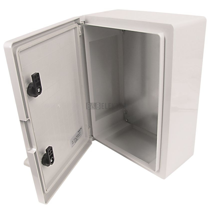 Univerzální rozvodná plastová skříň MAGNA 39134 ve vyšším krytí IP65, rozměry: 400x300x165mm, součástí skříně je pozinkovaná montážní deska, neprůhledné plné dveře, barva: světle šedá.