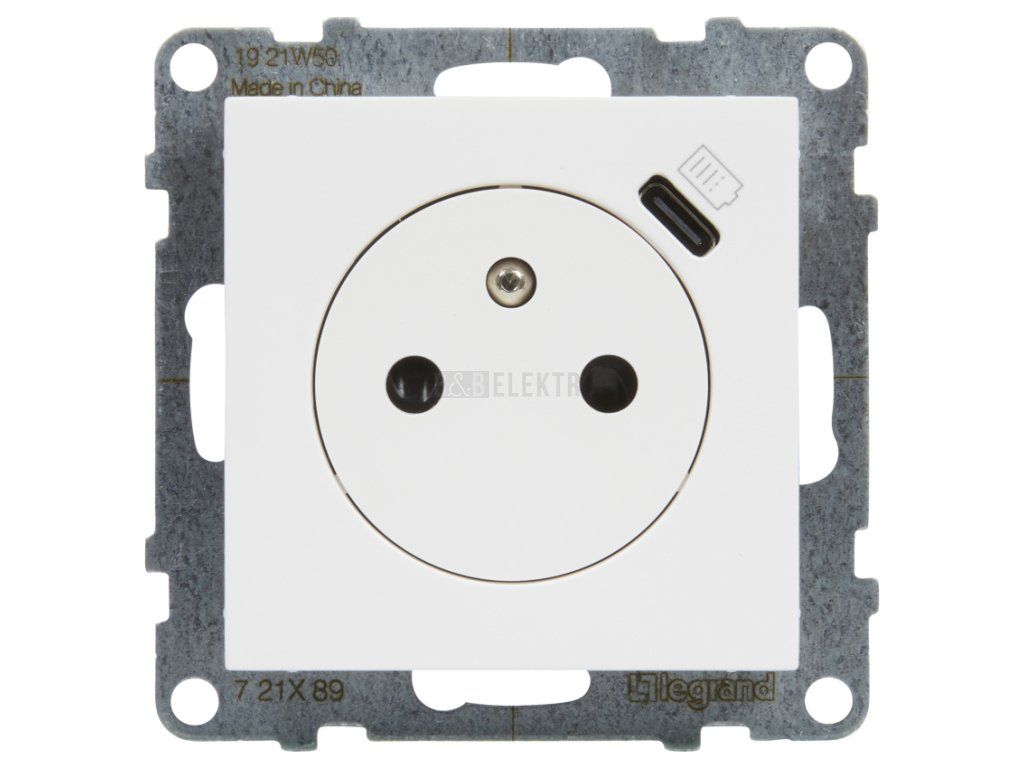 Suno zásuvka 2p+T s USB-C nabíječkou, bílá, automatické svorky, Legrand 721189