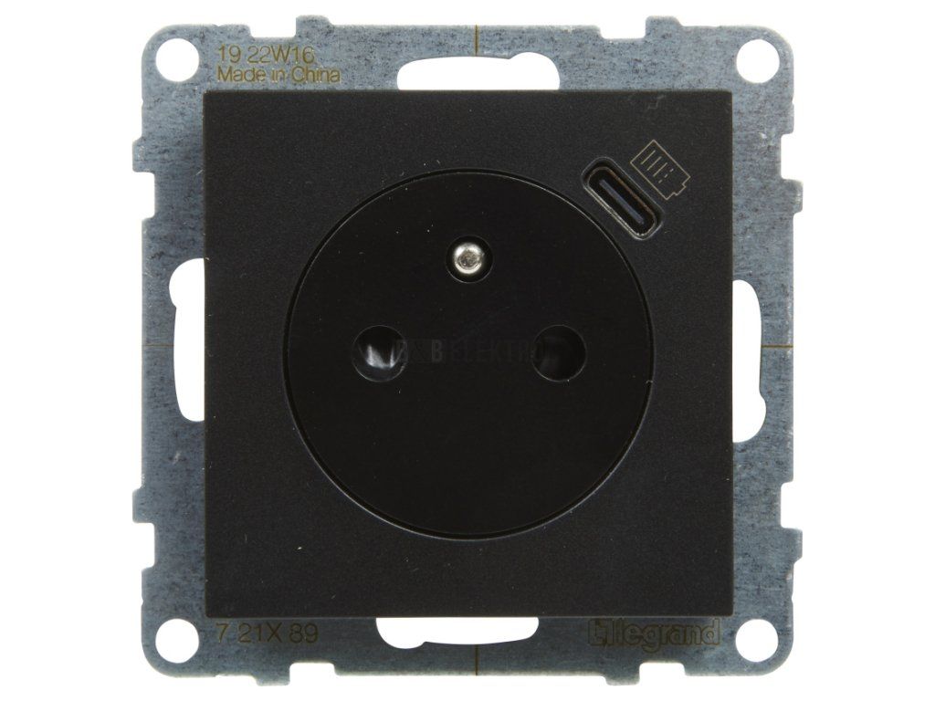 Suno zásuvka 2p+T s USB-C nabíječkou, černá, automatické svorky, Legrand 721489