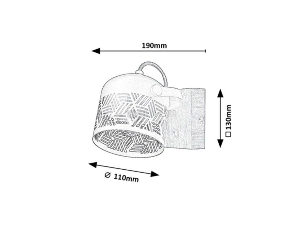 Bodové svítidlo Rotem, které reprezentuje industriální styl, bude charakteristickým kouskem zařízení vašeho moderního domova. Tento model navržený firmou Rabalux je primárně doporučen do vašeho obývacího pokoje, jídelny nebo ložnice, ale můžete jej nainstalovat i do kuchyně. Svítidlo Rotem vyrobeno z kovu a dřeva je doplněno matným černým stínítkem ve tvaru zvonu s charakteristickým vzorem a textilní šňůrkou. Na stěnu lze upevnit pomocí čtvercového dekoračního podstavce z ořechu. Toto svítidlo lze použít s jednou žárovkou o výkonu až 40W. Typ patice je E14. V závislosti na vašem vkusu a místě instalace si můžete pro toto svítidlo zvolit teplé nebo přírodní bílé zdroje světla. Bodové svítidlo Rotem lze ovládat pomocí kolébkového spínače na přední části ozdobného podstavce. Rozměry tohoto nástěnného svítidla jsou následující: šířka 130 mm, průměr stínítka 110 mm, vzdálenost svítidla od stěny 190 mm. Tento model je dodáván bez světelného zdroje.