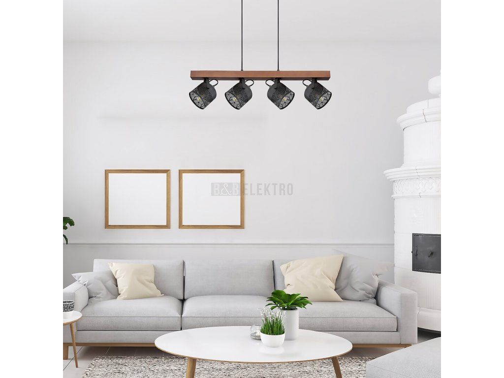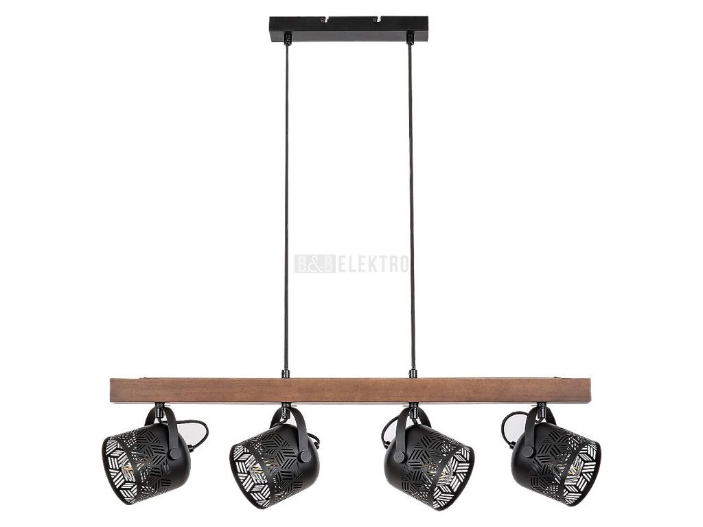 Závěsné svítidlo Rotem s 4 žárovkami, které reprezentuje industriální styl, bude charakteristickým kouskem zařízení vašeho moderního domova. Tento model navržený firmou Rabalux je primárně doporučen do vašeho obývacího pokoje, jídelny nebo ložnice, ale můžete jej nainstalovat i do kuchyně. Svítidlo Rotem vyrobeno z kovu a dřeva je doplněno matnými černými stínítky ve tvaru zvonu s charakteristickým vzorem a textilními šňůrkami. Na stěnu jej lze upevnit pomocí podlouhlého čtvercového dekoračního podstavce. Hlavy svítidla jsou umístěny v jedné řadě vedle sebe na vodorovné nosné tyči z ořechového dřeva, která je připevněna k ozdobné základně. Toto svítidlo lze použít se čtyřmi žárovkami o výkonu každé až 40W. Typ patice je E14. Díky flexibilním hlavám svítidla je tento model schopen snadno osvětlit i větší místnost. Rozměry závěsného svítidla se 4 žárovkami jsou následující: šířka 750 mm, průměr každého stínidla je 110 mm, vzdálenost od stropu 1 200 mm. Tento model je dodáván bez světelných zdrojů.