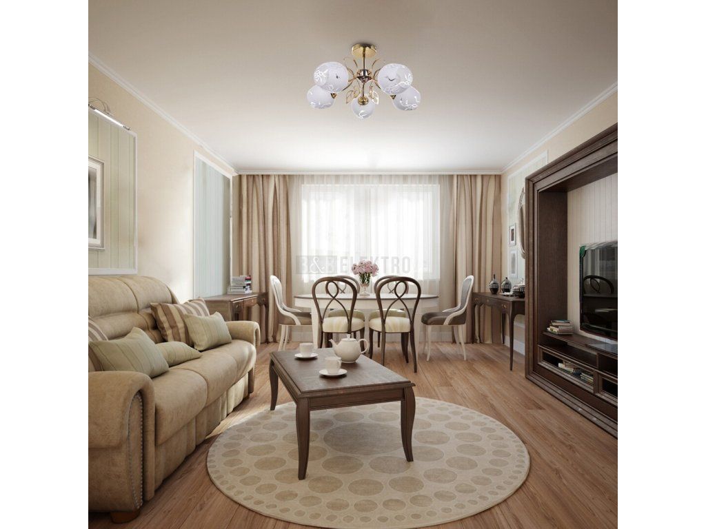 Stropní svítidlo Fauna s 5 žárovkami v klasickém stylu bude elegantním doplňkem k zařízení vašeho tradičního obývacího pokoje nebo ložnice. Stínidla z bílého skla se vzorem jsou připevněny ke zlatému kovovému svítidlu. Svítidlo lze připevnit na strop pomocí kulatého ozdobného podstavce. Kulaté stínidla s otevřeným dnem jsou připevněny k větvím světla, které se kroutí jako úponky a jsou zdobeny zlatými listy. Svítidlo Fauna může být použito s pěti žárovkami, každá s výkonem až 40W. Typ patice je E27. Pokud chcete vylepšit intimní a útulnou atmosféru, vyberte si pro toto svítidlo žárovky s teplým bílým světlem. Rozměry stropního svítidla Fauna s 5 žárovkami jsou následující: průměr 560 mm, vzdálenost od stropu 290 mm, instalační průměr 120 mm. Tento model se dodává bez světelných zdrojů.