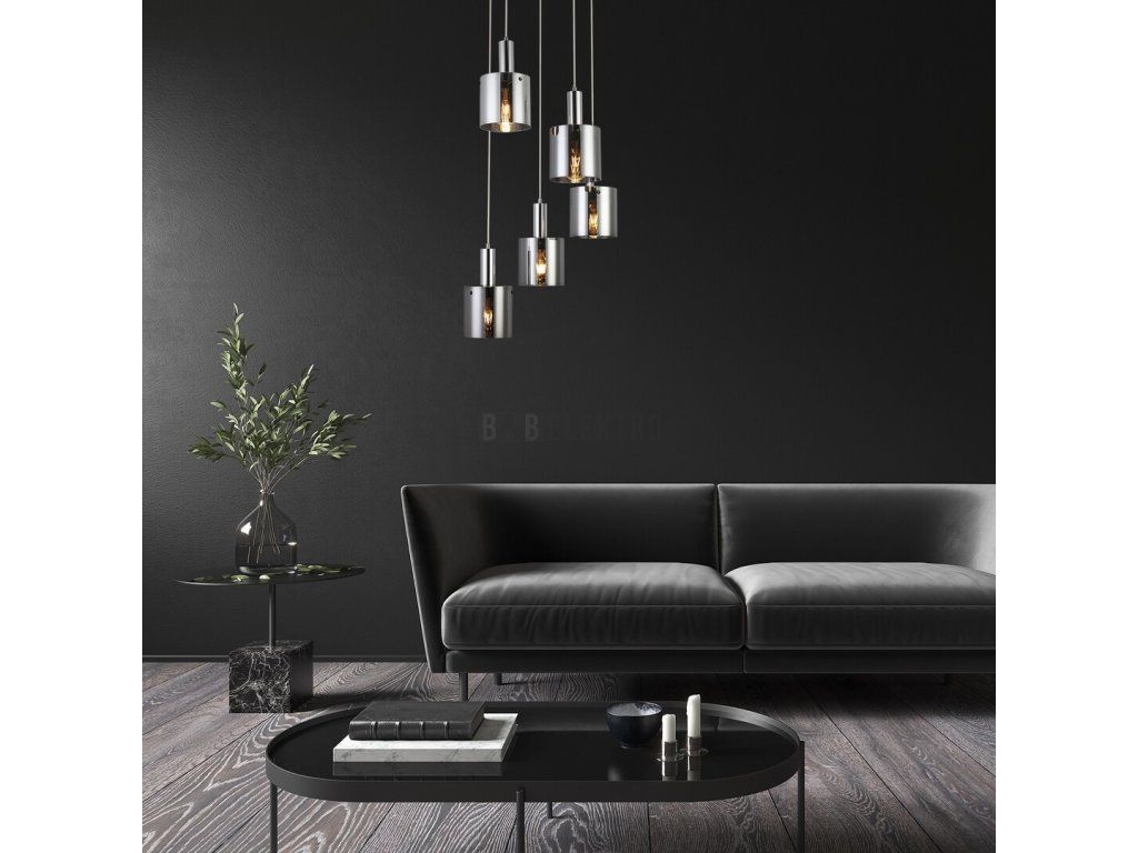 Moderní závěsné svítidlo Donati s 5 žárovkami bude nádherným kouskem nábytku do obývacího pokoje, kuchyně, jídelny nebo ložnice. Kovové hlavy svítidla v chromové barvě jsou doplněny válcovými stínítky z tónovaného skla. Svítidlo lze připevnit ke stropu pomocí velké okrouhlé dekorativní podstavy. Všech pět hlav svítidla visí v různých výškách, což činí vzhled tohoto závěsného svítidla ještě vzrušujícím. Tónovaná stínítka umožňují částečně vidět žárovky a současně filtrují jejich světlo, takže svítidlo Donati zajišťuje velmi útulné osvětlení. Závěsné svítidlo je možné použít s pěti žárovkami, každá s výkonem až 60W. Typ zásuvky je E27. Pokud chcete zvýšit intimní a útulnou atmosféru, vyberte si do tohoto svítidla žárovky vyzařující teplé bílé světlo. Rozměry závěsného svítidla Donati s 5 žárovkami jsou následující: průměr 420 mm, vzdálenost od stropu 1 600 mm. Tento model je dodáván bez světelných zdrojů.