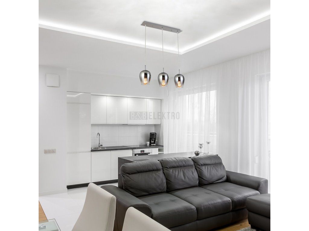 Trojité závěsné svítidlo Petunia v moderním stylu je možné nainstalovat do vašeho obývacího pokoje, kuchyně, jídelny nebo ložnice. Kovové svítidlo v chromové barvě je doplněno elegantními stínítky ve tvaru kalichu z tónovaného skla. Svítidlo lze připevnit ke stropu prodlouženou čtvercovou ozdobnou základnou. Tónovaná stínítka umožňují částečně vidět žárovky a současně filtrují jejich světlo, čímž svítidlo Petunia zajišťuje útulné osvětlení. Závěsné svítidlo je možné použít s třemi žárovkami, každá s výkonem až 15W. Typ zásuvky je E27. Chcete-li vytvořit intimní a útulnou atmosféru, vyberte si do tohoto svítidla žárovky vyzařující teplé bílé světlo. Rozměry trojitého závěsného svítidla Petunia jsou následující: šířka 600 mm, průměr každého stínítka je 140 mm, vzdálenost od stropu 1 200 mm. Tento model je dodáván bez světelných zdrojů.