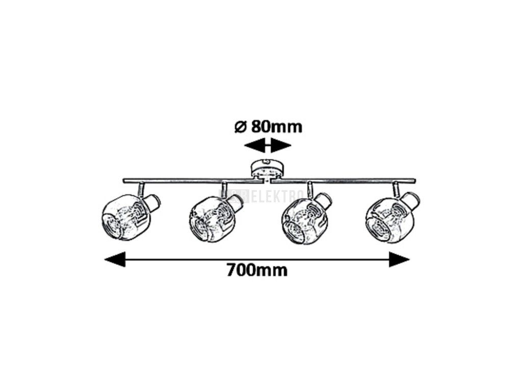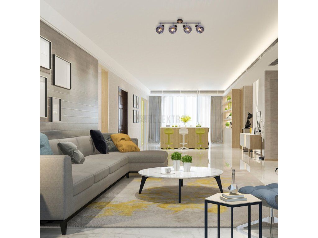 Čtyřnásobné bodové svítidlo Salazar vyrobeno z kombinace kovu a skla bude charakteristickým a atraktivním doplňkem vašeho domácího zařízení. Doporučujeme ho primárně do obývacího pokoje, ale můžete si ho umístit i na chodbu. Černé tělo má dubový vzor a je doplněno kulatým ozdobným podstavcem a skleněným stínítkem v kouřové barvě. Čtyři stínidla jsou v jedné linii. Díky nastavitelným hlavám svítidla je možné světlo svítidla ovládat podle přání. Bodové svítidlo lze použít se čtyřmi světelnými zdroji s výkonem každého do 40 W, patice typu E14. Světlo je jemně filtrované zpod tmavých stínítek svítidla Salazar, které vyzařují příjemnou a útulnou atmosféru. Aby jste dosáhli dokonalý efekt, doporučujeme používat zdroje teplého bílého světla. Šířka čtverného bodového svítidla Salazar je 700 mm a jeho průměr je 80 mm. Tento model se dodává bez žárovek.
