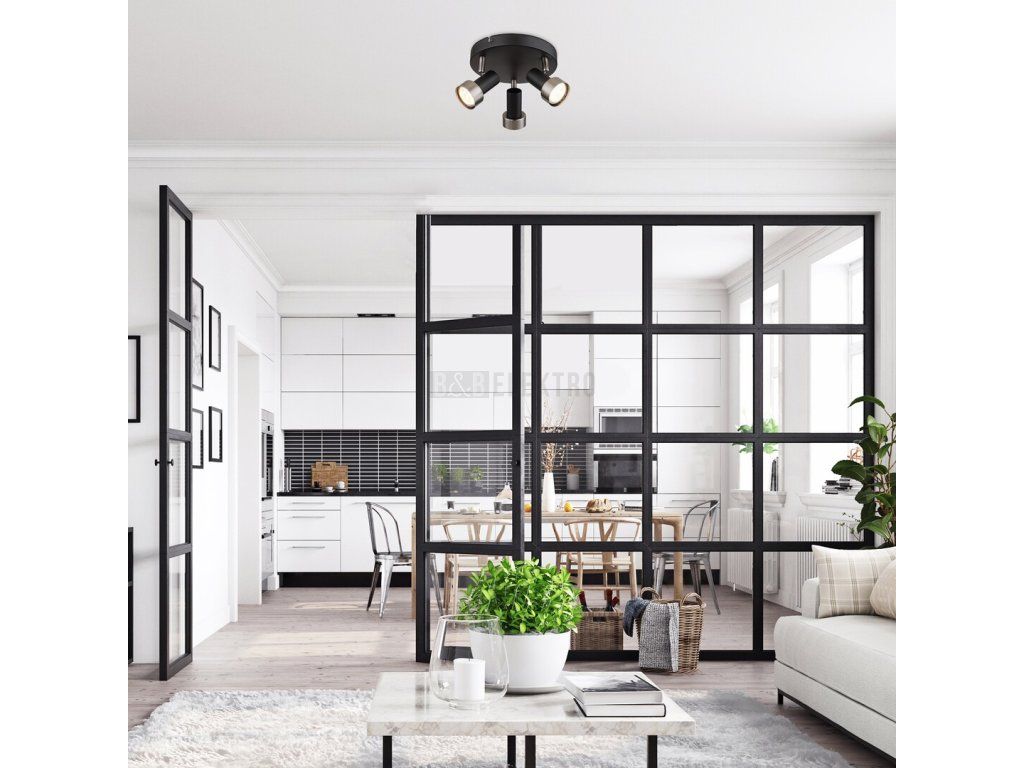 Trojité stropní bodové svítidlo Konrad v industriálním stylu se doporučuje především do obývacího pokoje nebo ložnice. Matný černý model, celý vyrobený z kovu, je doplněn stříbrnými stínítky a lze jej připevnit na strop pomocí velké kulaté ozdobné základny. Díky pohyblivým hlavám lampy můžete ovládat světlo lampy, jak chcete. Konrad lze použít se třemi světelnými zdroji, každý s výkonem do 50 W, objímka typu GU10. Dle našeho vkusu a místa instalace si můžeme zvolit světelné zdroje s teplým nebo přirozeným bílým světlem. Pokud chceme stropní svítidlo použít v ložnici, doporučujeme jej provozovat se zdroji teplého bílého světla, které napomáhají navození intimní, domácké atmosféry. Rozměry trojitého bodového svítidla Konrad: průměr 240 mm, vzdálenost od stropu 115 mm, montážní průměr 190 mm. Tento model je dodáván bez světelných zdrojů.