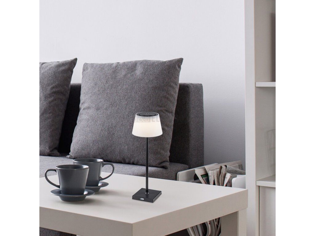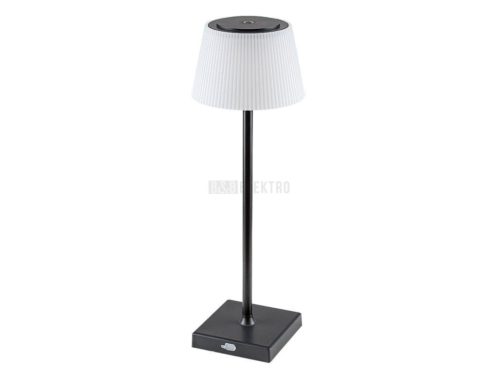 Stolní lampa Taena v moderním stylu nabízí mnohem více než průměrný model vyrobený pro podobný účel. Svítilna s extra funkcemi je skvělou volbou do obývacího pokoje nebo ložnice. Model vyrobený z kovu a černé barvy doplňuje bílá, mírně se rozšiřující plastové stínítko připomínající plisovanou sukni a čtvercový ozdobný podstavec. Taena má zabudovaný LED světelný zdroj s výkonem 4W a životností 25000 hodin, světelný tok svítidla: 200 lumenů, světelný tok světelného zdroje je 330 lumenů. Barevnou teplotu světelného zdroje lze nastavit mezi 3000-5000 K a měnit lze i jas. Obě funkce lze ovládat pomocí dotykového spínače. Lampa má 3,7V baterii s kapacitou 1800 mAh a lze ji nabíjet pomocí USB kabelu. Krytí IP44 zajišťuje ochranu proti pronikání pevných částic o průměru větším než 1 mm, jakož i proti stříkající vodě z jakéhokoli směru. Rozměry stolní lampy jsou následující: výška 380 mm, průměr 130 mm, montážní průměr 95 mm.