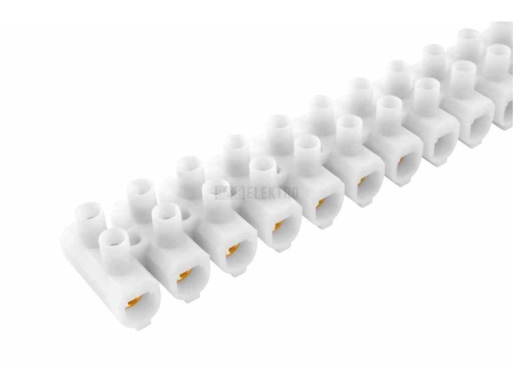 Svorkovnice instalační lámací EKL 5 E-SVCE - 12 pólová, průřez vodiče 16-35mm2, barva bílá, mosazná, napětí 750V, jmenovitý proud 125A, rozměr 211x29,6x36,4mm.