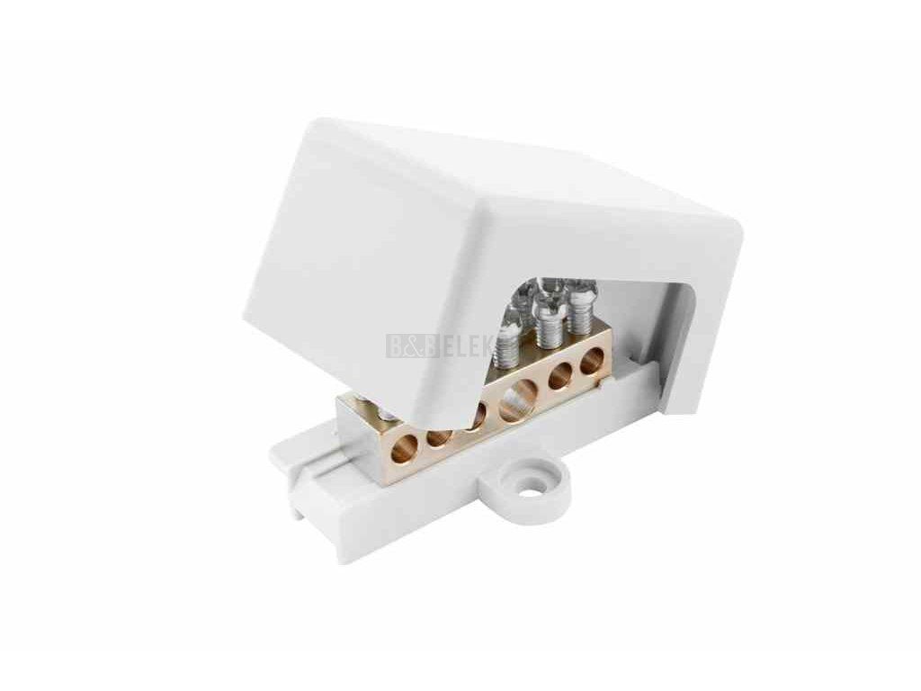 Svorkovnice uzemňovací PAS 6 - krytá svorka, 2-řadá. 1x vodič 6-25mm2, 5x vodič 1,5-6mm2, rozměry 31x64x41mm.