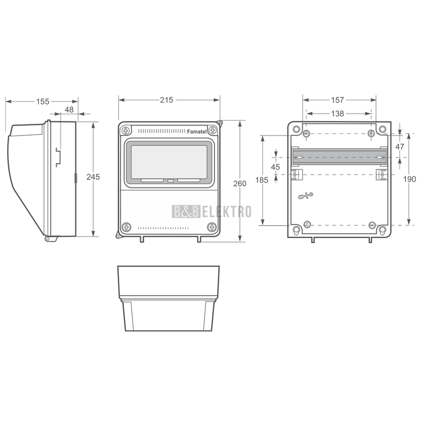Zásuvková skříň FAMATEL v165-ZSF20100000.1 /3957 je nízkonapěťový rozváděč navržený pro bezpečné připojení jednofázových i třífázových zařízení. Krytí IP54 poskytuje ochranu proti prachu a stříkající vodě, což ji činí ideální pro průmyslové i komerční aplikace. Skříň obsahuje 2 zásuvky 230V/16A s ochranným kolíkem dle ČSN a 1 zásuvku 400V/16A/5pól, jištěné přístroji EATON 10kA a chráněné proudovým chráničem PF7-40/4/003-A.