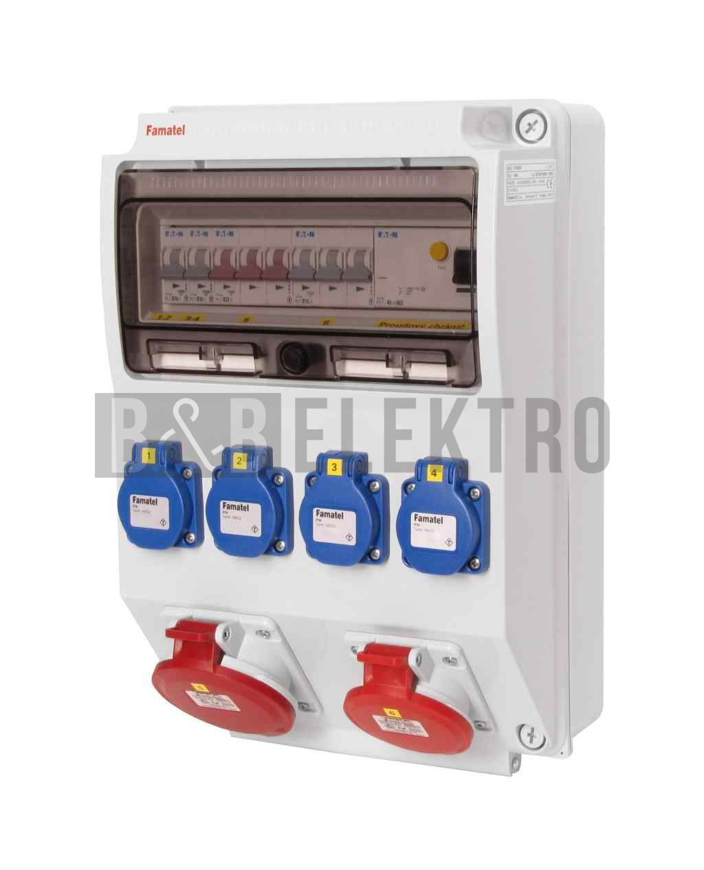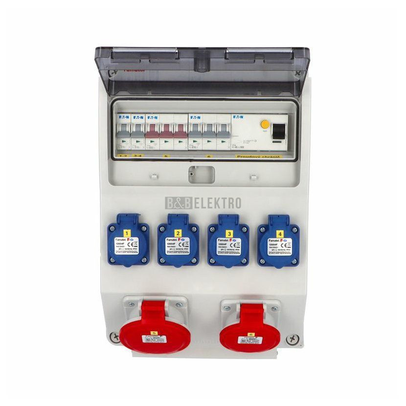 Zásuvková skříň IP54 4x230V/16A, 1x400V/16A/5p, 1x400V/32A/5p s jištěním 2xPL7-B16/1, 1xPL7-B16/3, 1xPL7-B32/3 a proudových chráničem PF7-40/4/003-A 398x266x153mm Famatel ZSF40101000.1 /3959