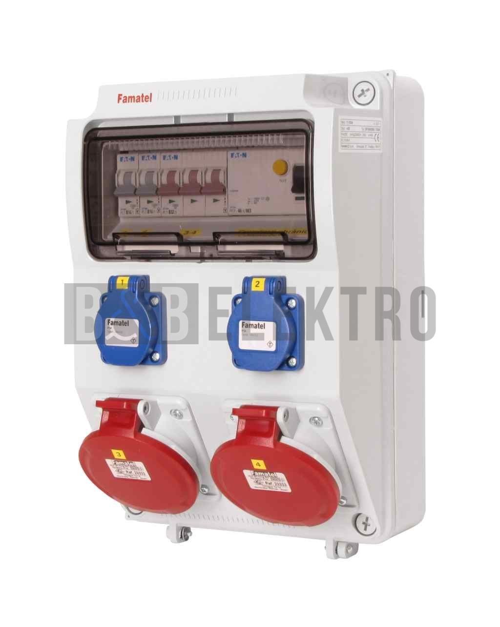 Zásuvková skříň FAMATEL v425-ZSF20002000.1 /3958 s krytím IP54 a proudovým chráničem 40/4/003-A (30 mA). Obsahuje 2 zásuvky 230V/16A a 2 zásuvky 400V/32A (5pól). Jištění zajišťují přístroje EATON 10kA. Pouzdro typu 3958 o rozměrech 330 × 215 × 155 mm.