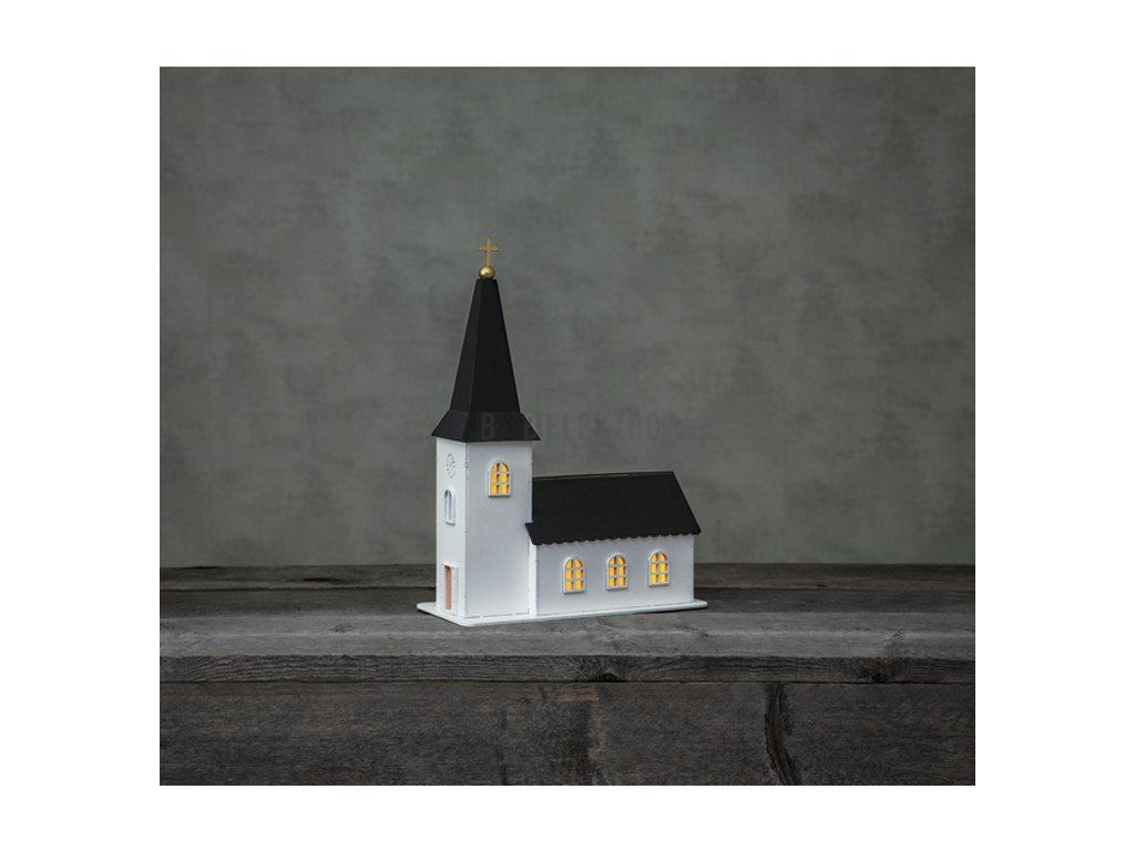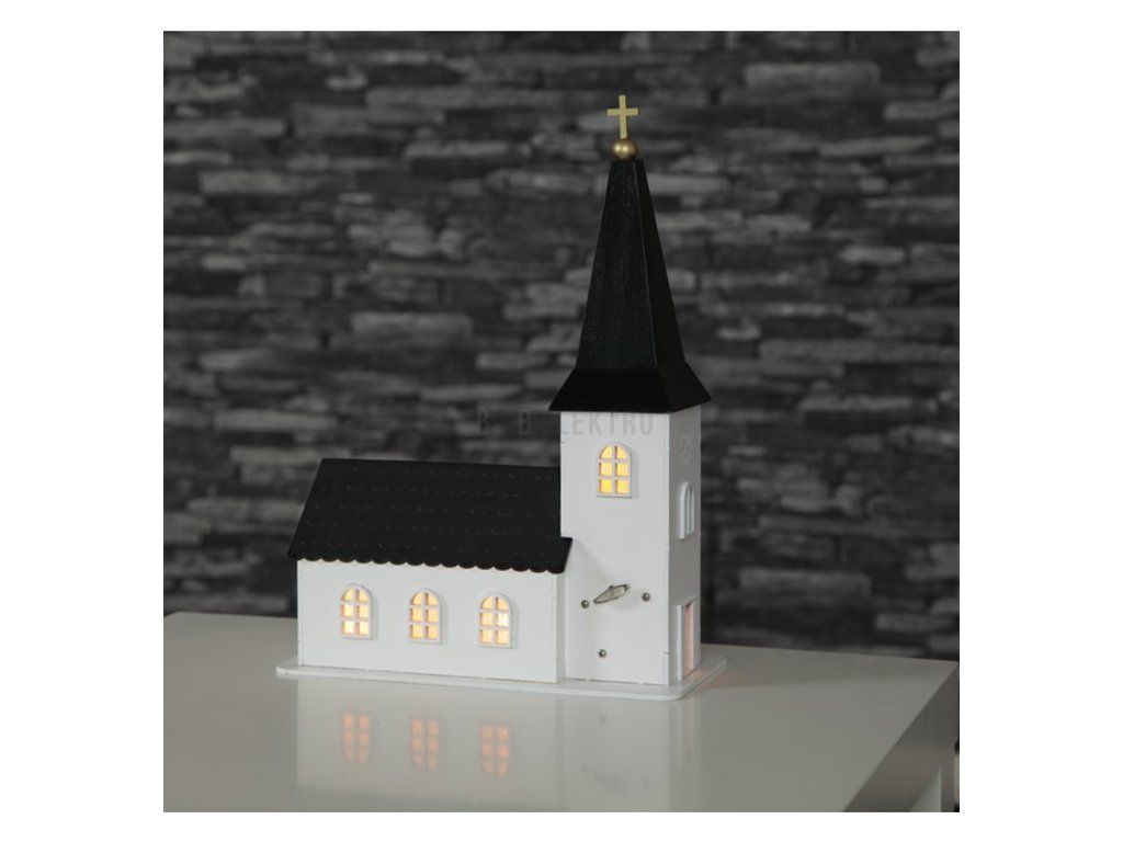 Bílo-černý kostel na baterie. Hrací skříňka hraje příjemnou vánoční melodii. Krásna adventní dekorace pro příjemnou vánoční atmosféru.