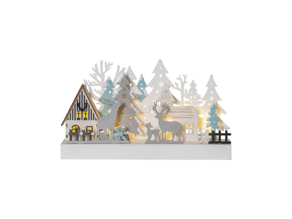Krásná zimní vánoční krajinka obsahující chaloupky, les a rodinku jelenů. Tento krásný dekorativní svícen dokresluje idilickou vánoční domácí atmosféru. Obsahuje 6 LED žároviček, o napájení se stará baterie 2xAA (není součástí).