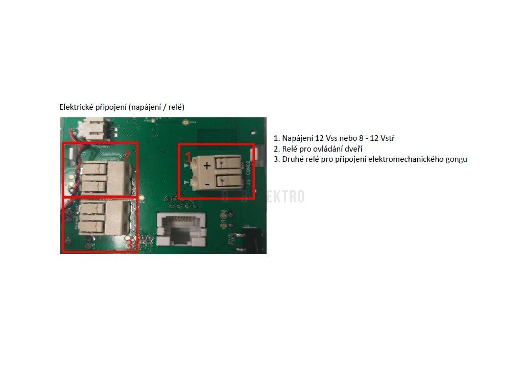 Panel nabízí dvě připojení přes relé. Jeden pro funkci otevírání branky (čas volitelný přímo v APP) a jeden pro spuštění elektromechanického zvonění nebo otevírání brány.