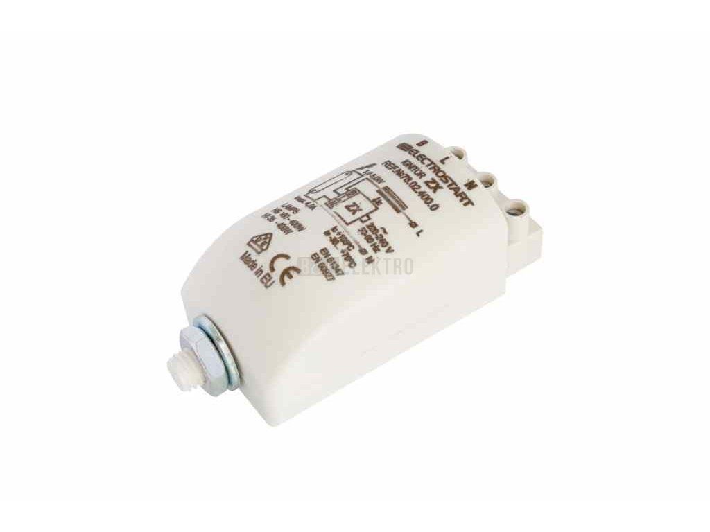 Elektronický zapalovač ZX 70-400 - metalhalogenidové výbojky 35-400W, sodíkové 70-400W, vysokonapěťové impulsy 3-5kV, maximální proud 4,5A, 220-240V, 50-60Hz, rozměr 75x34x30mm.