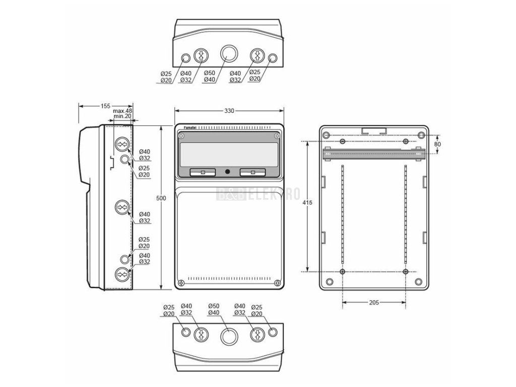 Zásuvková skříň FAMATEL v625-ZSF40101000.1 /3952 s krytím IP54, jištěná proudovým chráničem 40/4/003-A (30 mA). Obsahuje 4 jednofázové zásuvky 230V/16A a 2 třífázové zásuvky 400V (16A a 32A, 5pól). Pouzdro typu 3952 s rozměry 500 × 330 × 155 mm je robustní a odolné proti prachu i vodě.