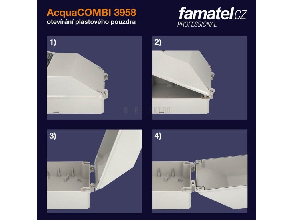 Zásuvková skříň FAMATEL v360-ZSF40000000.0 /3958 s krytím IP54 obsahuje 4 zásuvky 230V/16A, jištěné přístroji EATON 10kA (4× PL7-B16/1). Kompaktní ABS pouzdro (330 × 215 × 155 mm) je bezhalogenové, UV odolné a splňuje normy IEC 61439-3. Vhodná pro povrchovou montáž v nízkonapěťových rozvodech.