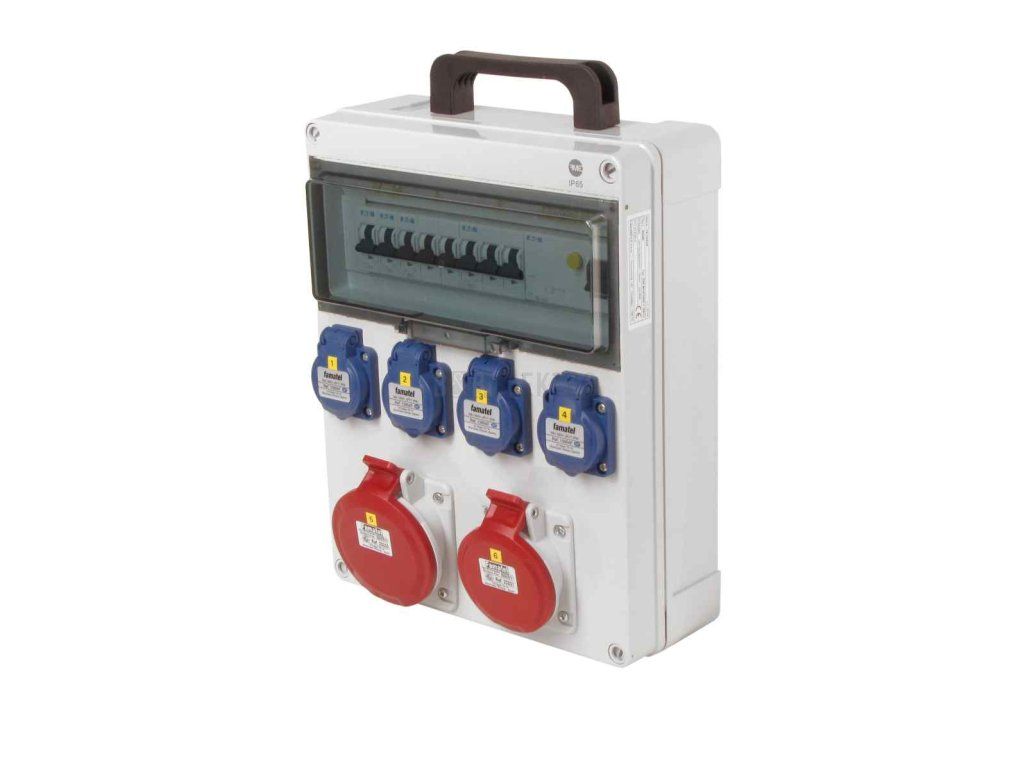 Přenosná zásuvková skříň FAMATEL fb34005-6kA - ZSF40101000.1 /5813, krytí IP54, vybavená proudovým chráničem 40/4/003-A. Obsahuje 4 zásuvky 230V, 1 zásuvku 400V/16A, a 1 zásuvku 400V/32A. Ideální pro mobilní použití díky integrovanému držadlu.